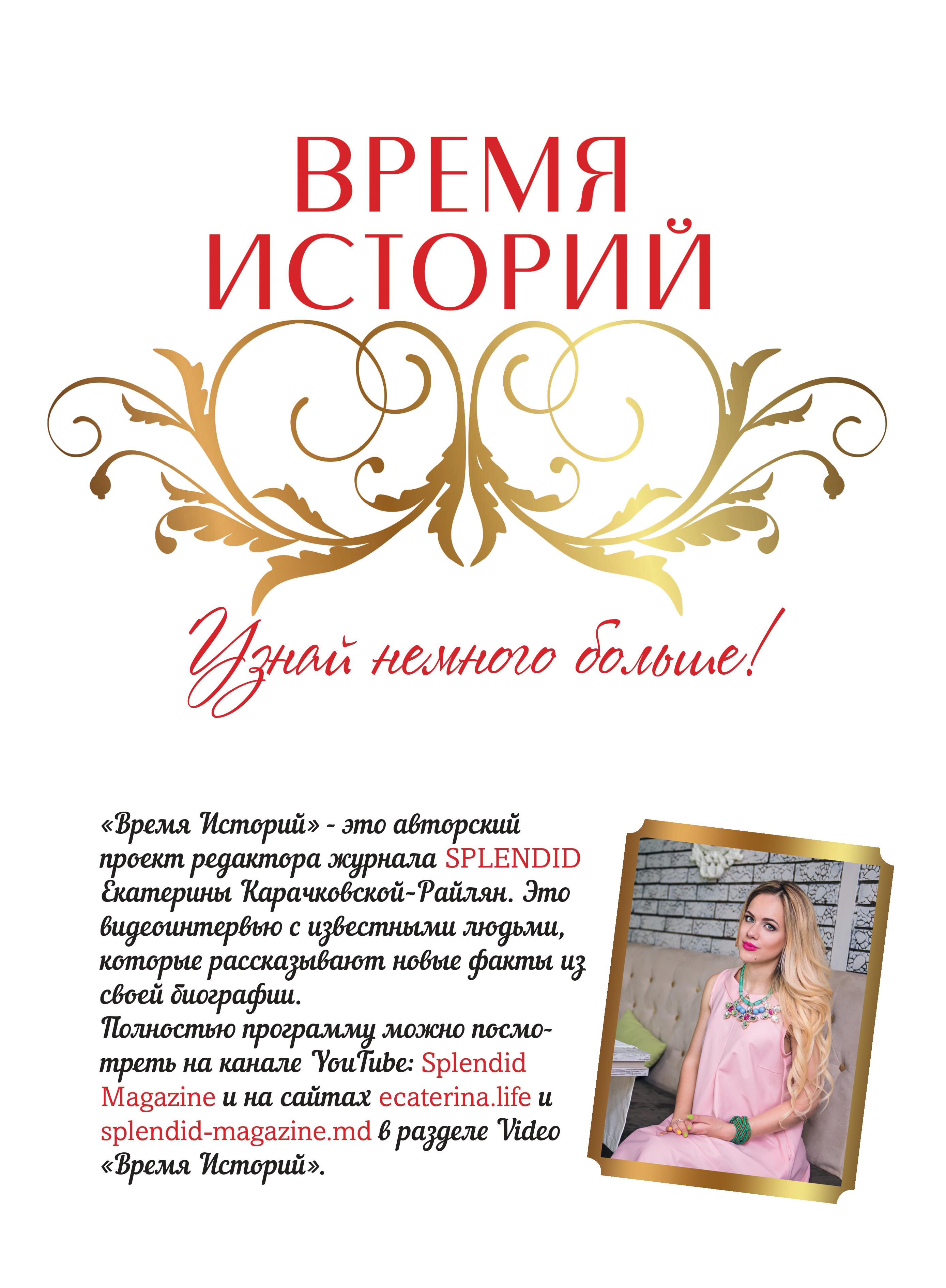 Екатерина Карачковская-Райлян: Прежде всего авторская передача «Время Историй» — это отдельный видеопродукт, который издает информационный журнал SPLENDID. Мои гости – это известные всей стране люди, которые в непринужденной дружеской беседе рассказывают о своей жизни. Естественно, такой формат придумала не команда журнала и не я лично, но подача, вопросы и даже монтаж для наших зрителей мы тщательно готовим каждый выпуск.